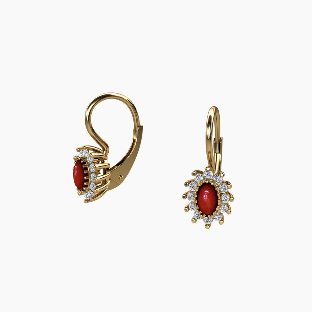 Kolczyki złote pr. 585 z Koralem o wymiarach 4 mm x 6 mm oraz z cyrkoniami.