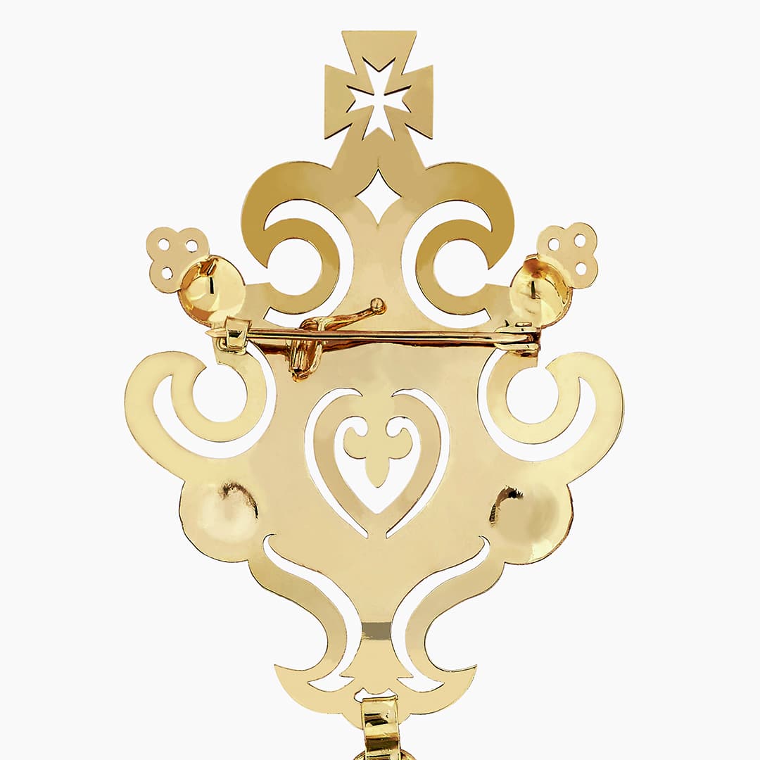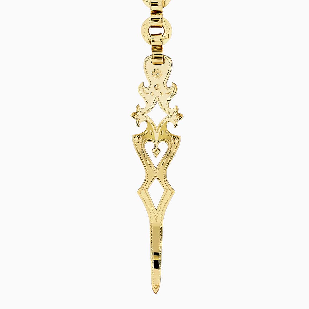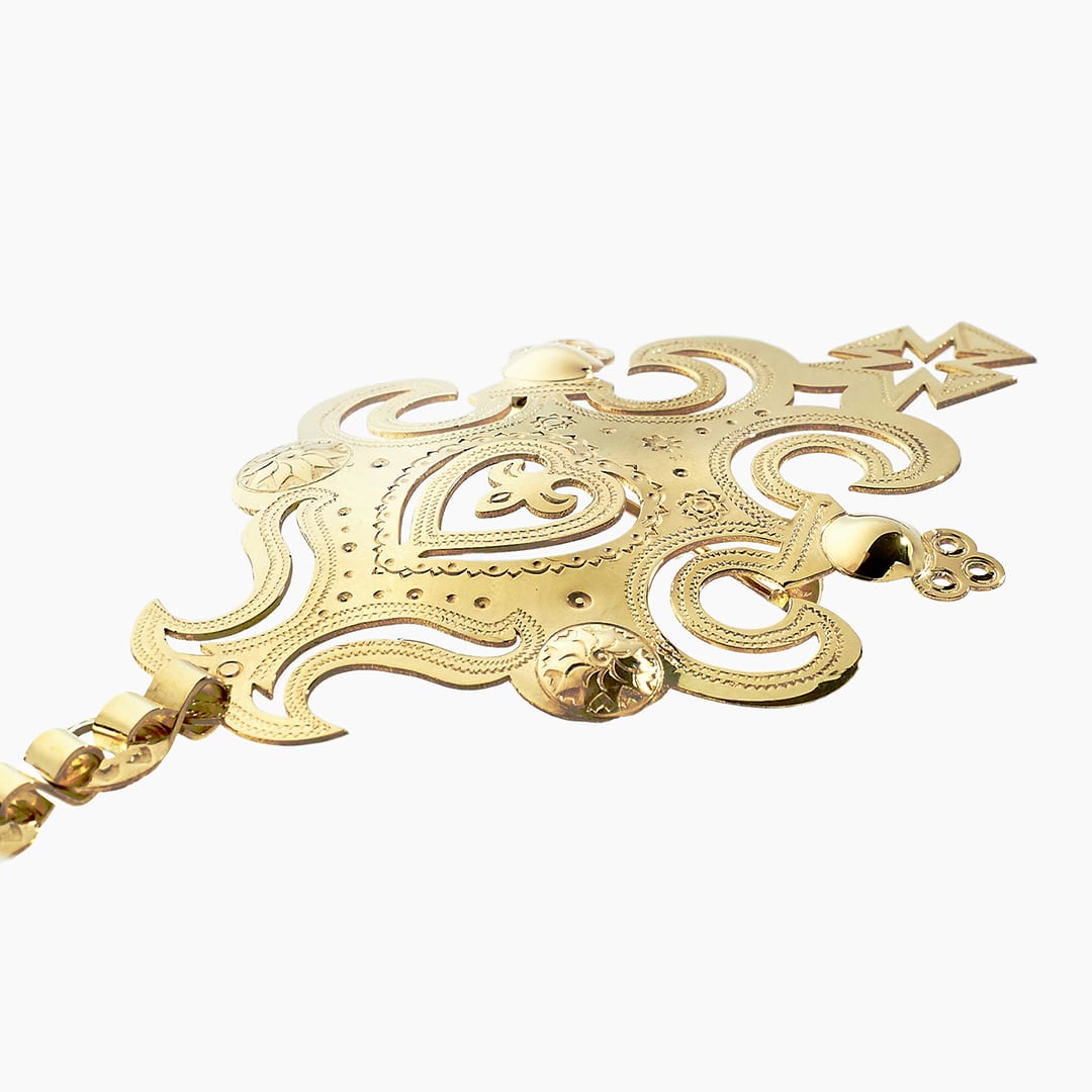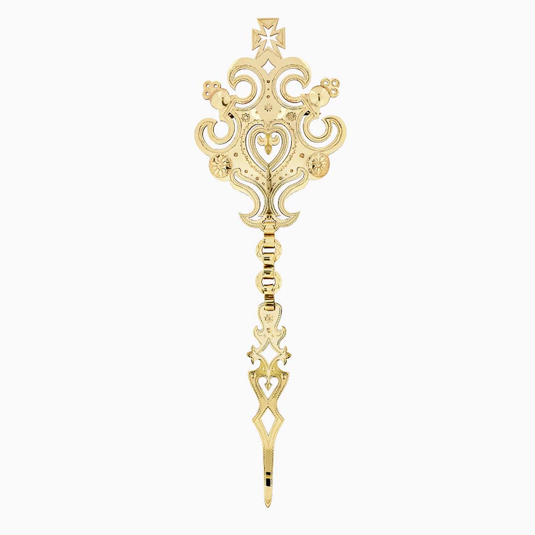 Spinka Góralska wykonana ręcznie, ze złota próby 585, o wymiarach 200×60 mm i wadze 33 gram.